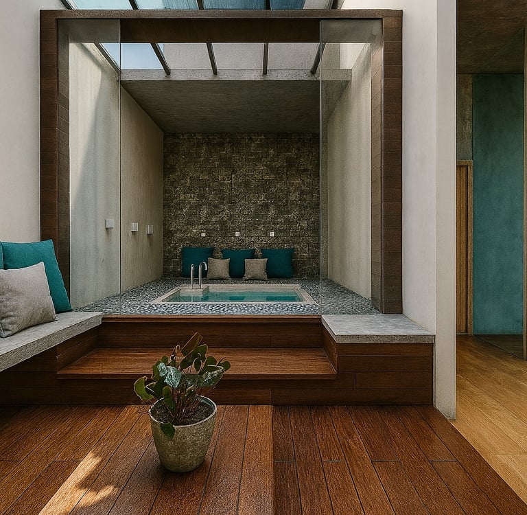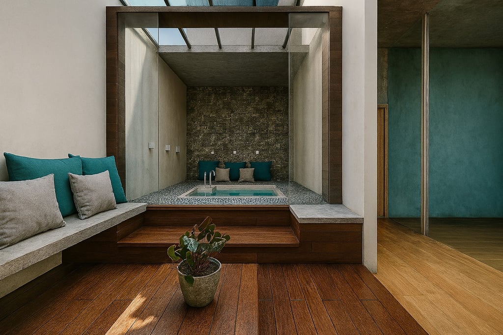 Teak-toned wooden flooring, built-in seating, and soft-toned cushions add warmth and comfort, reflecting the Chettinad-inspired material palette. The glass enclosure and skylit roof with exposed rafters bring in natural light, creating a calm and rejuvenating atmosphere.